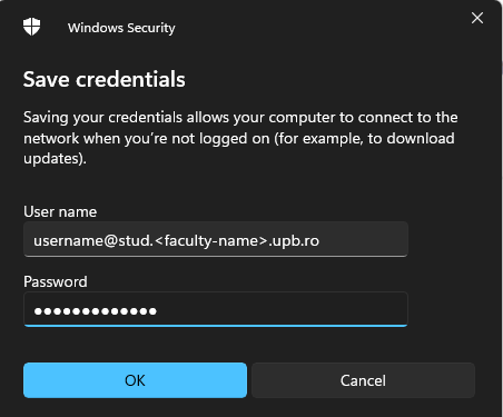 Enter your username and password provided to you in my.upb.ro such as the following email: