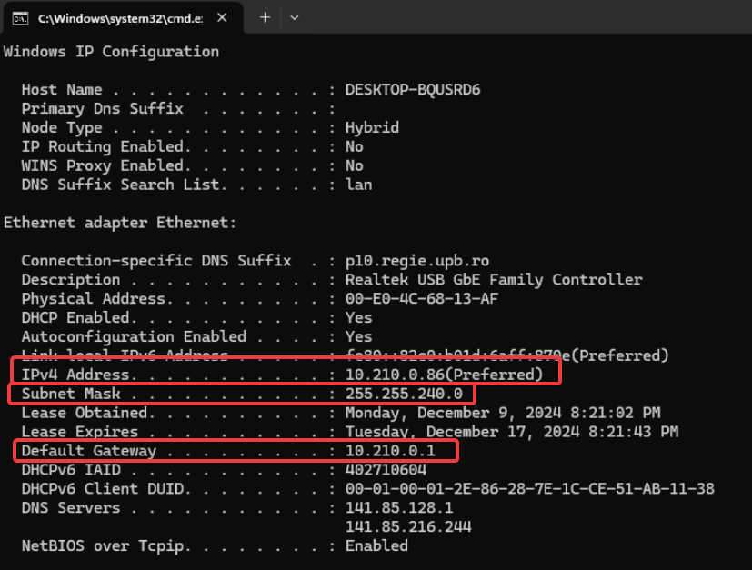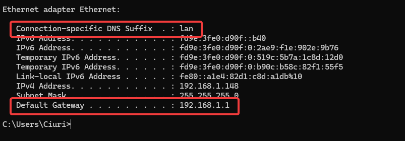 While in the same window of Command Prompt or cmd.exe, now being connected to the router you should see a different output of ipconfig.