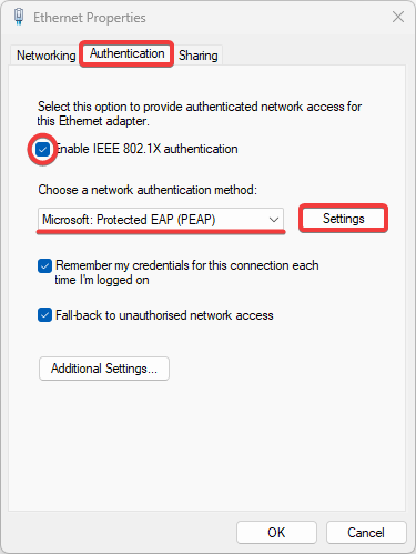 Choose network authentication method: Microsoft: Protected EAP (PEAP).