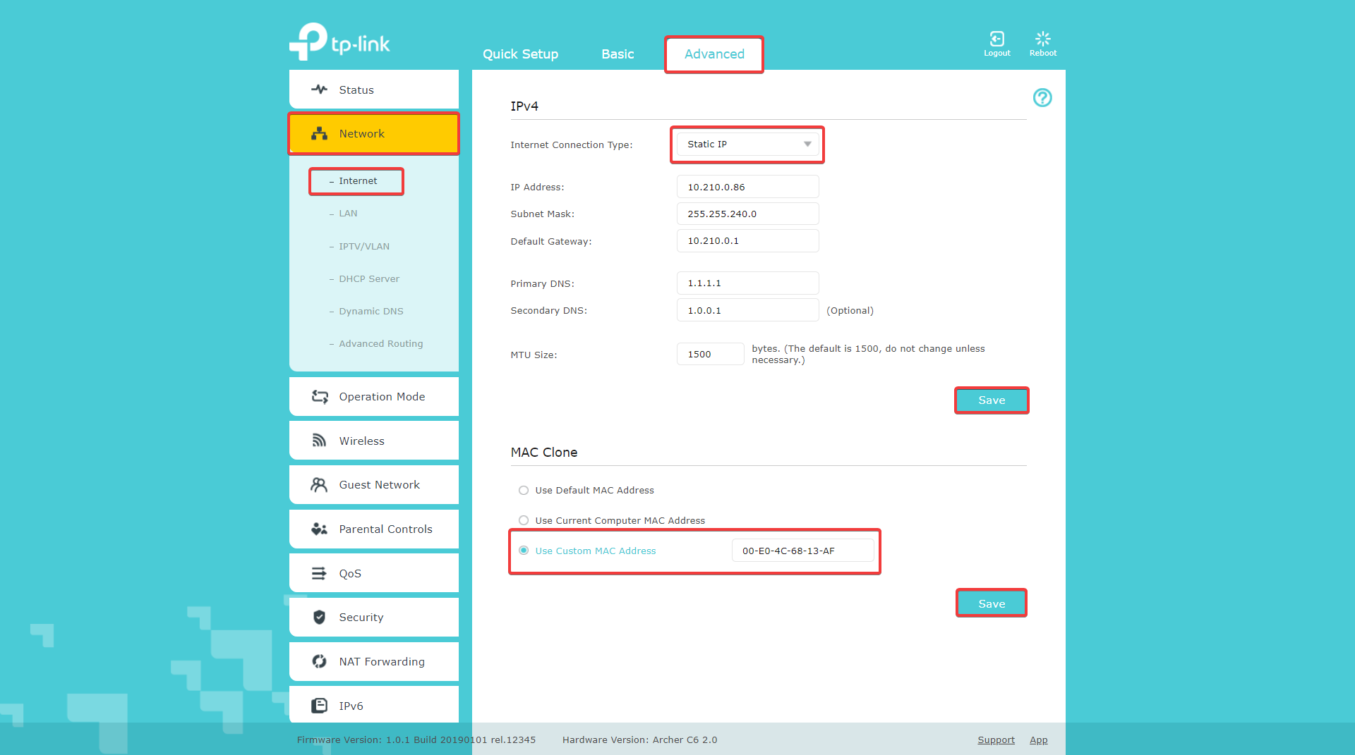Once on this page, navigate to the Advanced section of your router and in the Internet settings tab and fill out the previously gathered information from ipconfig as shown in the picture.